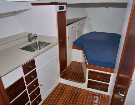 SHOOTING STAR is a Melvin and Morelli designed catamaran built in Virginia and brought to Cape Cod without a completed interior. Olsen Marine took on the interior building project and installed lightweight furniture, flooring and miscellaneous components with trim and paint.